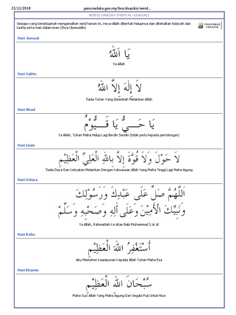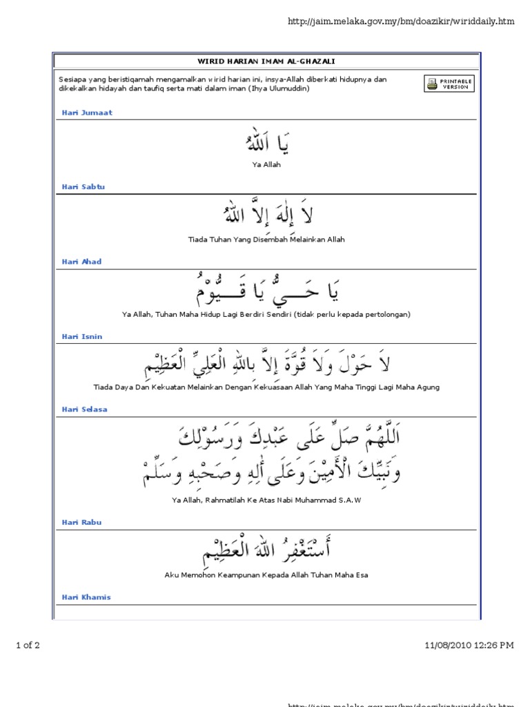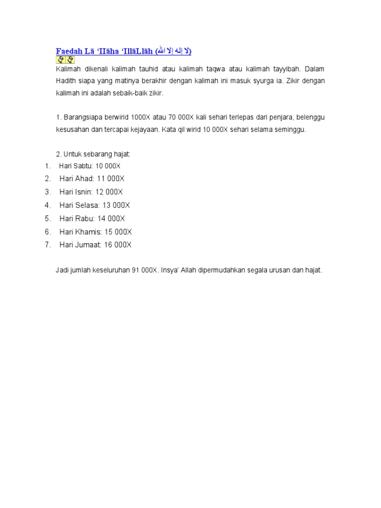 Открыть страницу «wirid harian» на facebook. Dalam bahasa arab juga, hari isnin disebut sebagai yaumul ithnain (,) smile emoticon smile emoticon. Wirid ini sudah lama di amalkan di gugusan tanah melayu. Dan maha besarpengajiankitab hikam kuliah maghrib hari khamis ( 01. Wirid hari selasa allahumma salli'ala sayyidina muhammad.1000x *ya allah, limpahkanlah rahmat atas junjungan kami nabi muhammad saw amin*.